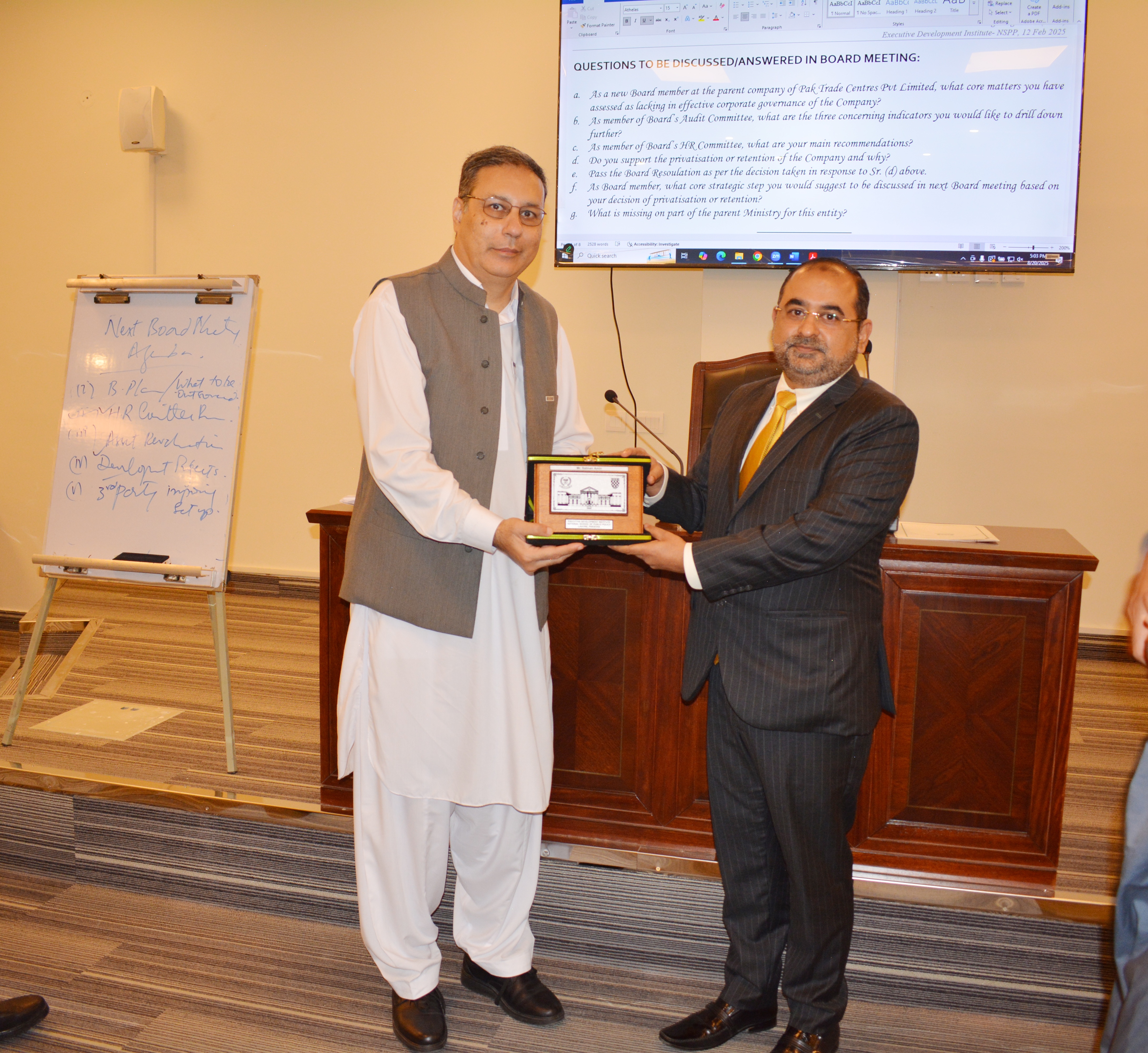 The Executive Development Institute of the National School of Public Policy organized a 3-Day Directors’ Training Program (DTP) for State-Owned Enterprises (SOEs) from 18thto 20thAugust,2025. The program was attended by 46 Participants from across the country, including civil servants/officers from federal and provincial governments, as well as executives from both state-owned enterprises and the private sector. The participants represented a diverse range of institutions, including the Pakistan Airport Authority (PAA), National Highway Authority (NHA), GHQ–Pakistan Army, Strategic Plans Division, Transport & Mass Transit Department, College, Higher & Technical Education (CH&TE) Department, Pakistan Stone Development, Maritime Technologies Complex, Punjab Municipal Development Fund (PMDF), Price Control & Commodities Management (PCCM), Punjab Cattle Market Management & Development Company (PCMMDC), Punjab Health Initiative Management Company (PHIMC), National Insurance Company Limited (NICL) Islamabad, SNGPL, NFC, EOBI, IESCO, NESCOM, SUPARCO, Rawalpindi Waste Management Company (RWMC), Qaswa Industries (Pvt.) Ltd., Roshan Packages (Pvt.) Ltd., and the National School of Public Policy (NSPP), Lahore.