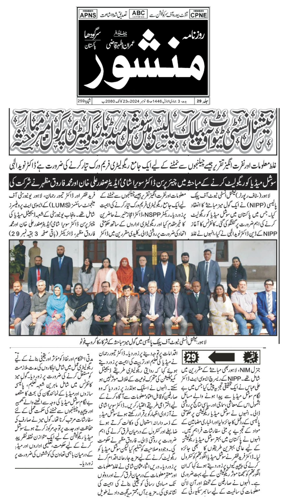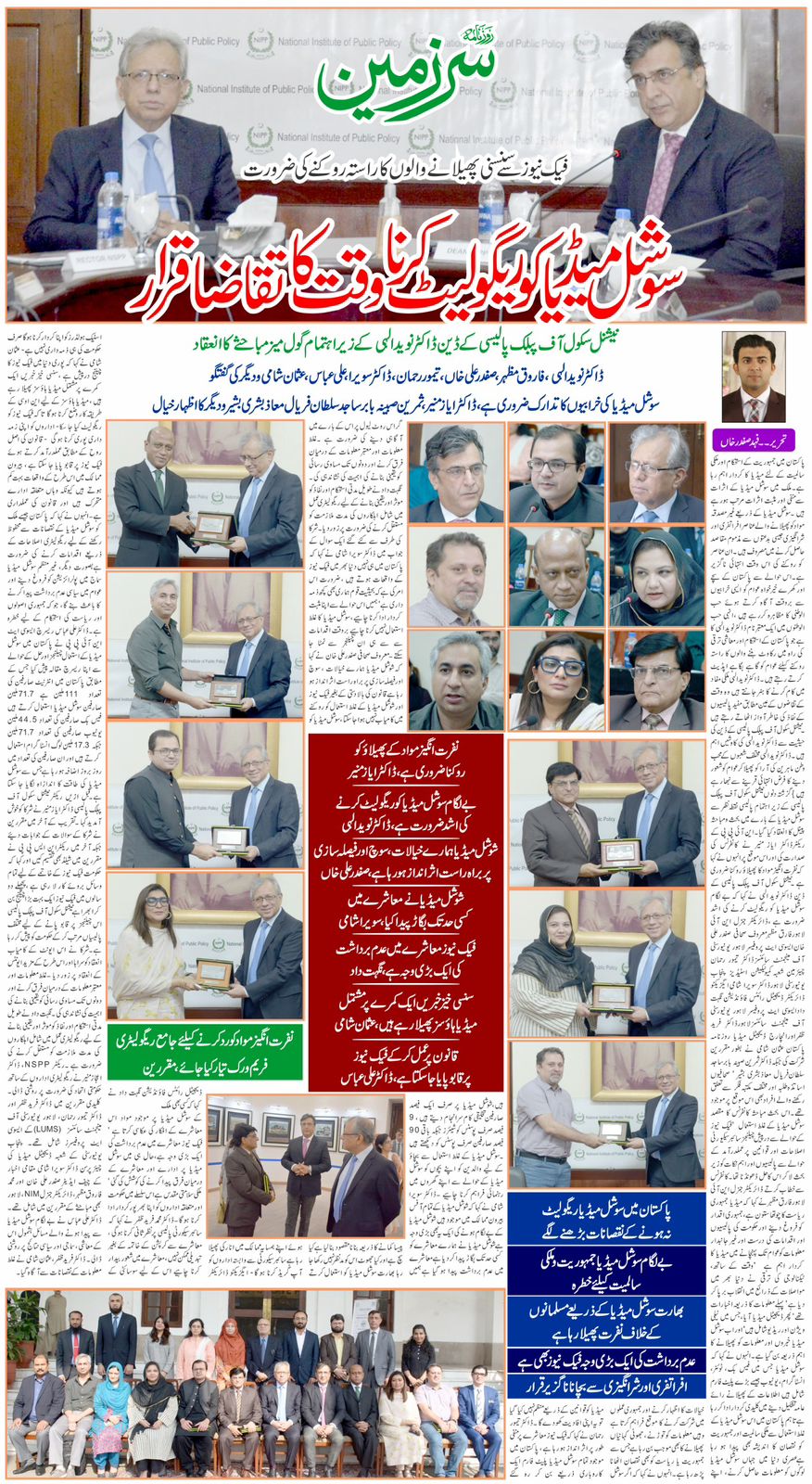 Rector NSPP, Dr. Ijaz Munir welcomed attendees and highlighted the need for government alignment with regulatory bodies. Key speakers included Dr. Fareed Zafar and Dr. Taimur Rahman, Associate Professors at the Lahore University of Management Sciences (LUMS); Dr. Savera Shami, Chairperson of the Department of Digital Media at the University of Punjab; Mr. Safdar Ali Khan, Chief Editor of Daily Sarzameen; and Mr. Muhammad Farooq Mazhar, Director General of NIM, Lahore.